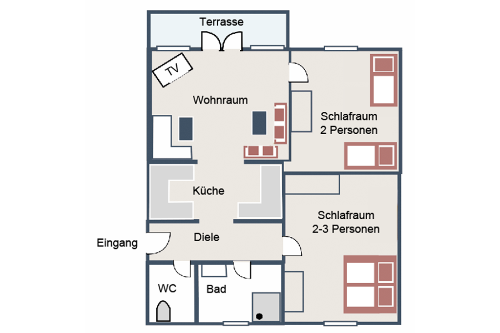 This apartment measures approximately 70m2 in size and includes two separate bedrooms (one double and one twin), one well equipped kitchen, a living room with a pull-out sofa as well as a bathroom equipped with a shower and a separate restroom.
