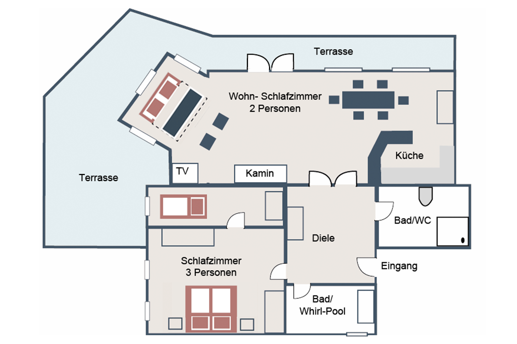 Das Appartement verfügt über ein großes Schlafzimmer mit Doppelbett einen kleinen getrennten Schlafraum mit Einzelbett, einen großen Wohnraum mit einem Schlafsofa und einem großem Esstisch sowie einer komplett ausgestatteten Küche, einen geräumigen Vorraum, ein Badezimmer und eine extra Dusche mit WC.